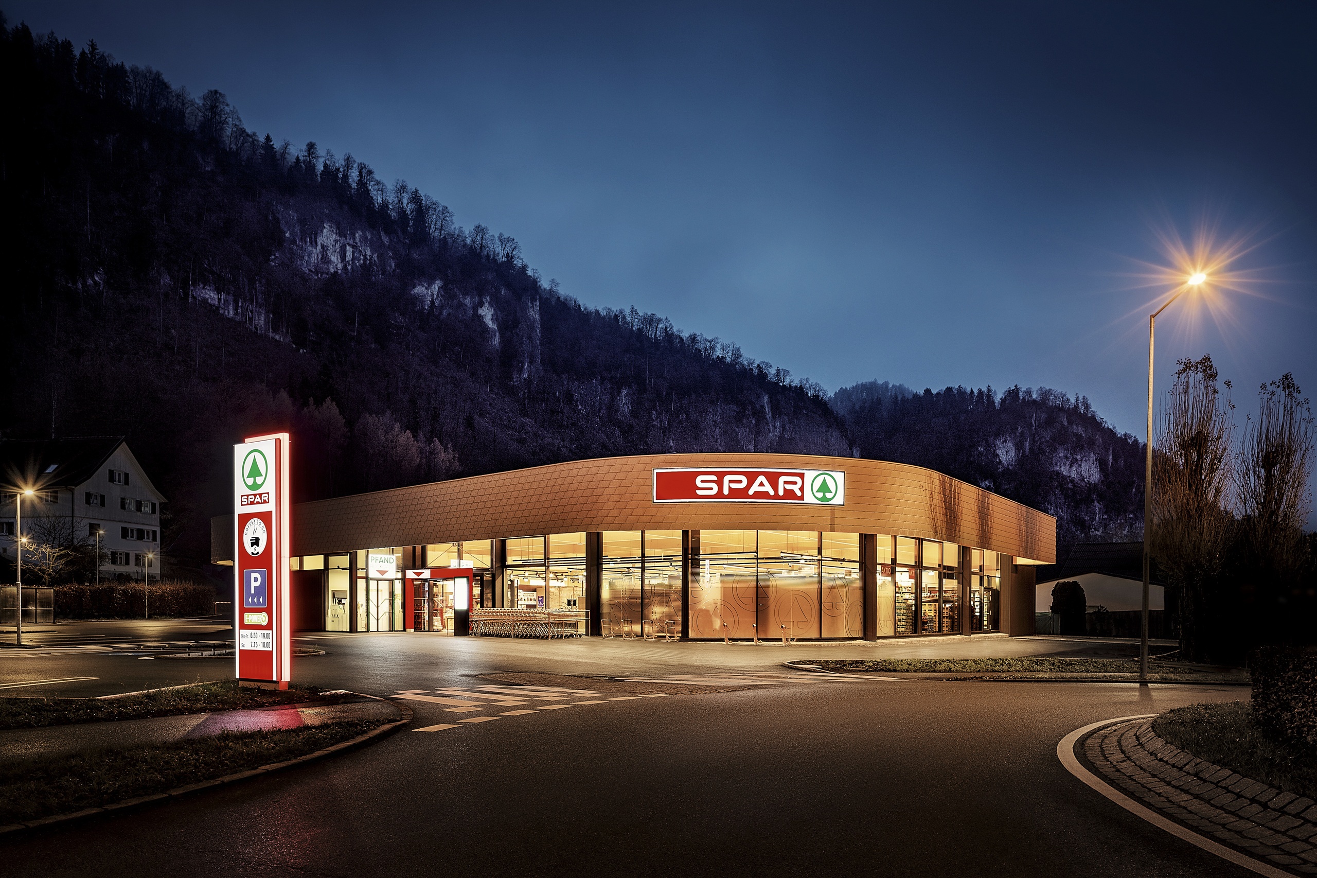 Der bestehende Einkaufsmarkt wird im Innen- und Außenbereich grundlegend saniert. Erweiterungen kommen innerhalb der bestehenden Dachauskragung zu liegen. Neben Innenraum und Haustechnik werden die Fassaden allseitig neu gestaltet und dem Gebäude ein frisches einladendes Erscheinungsbild verliehen.